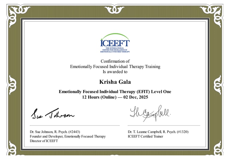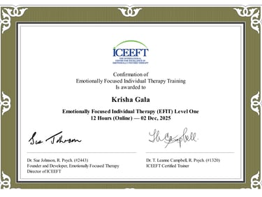 As a couple, we came in carrying years of misunderstandings and distance. Krisha helped us slow down, really listen to each other, and rebuild trust step by step. Therapy gave us a safe space to share without fear of judgment. Today, our bond feels stronger, more open, and more compassionate than ever.
